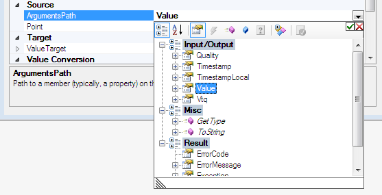 A binding can be involved in multiple binding operations (e.g. read and write), but there is just a single arguments path selection for the whole binding, and the set of arguments might be different for each operation. The arguments path should be valid for all the binding operations that are enabled on the binding. The drop-down editor offers a combined view of the possible arguments. For this reason, argument categories can change (by combining) as well: For example, in OPC DataAccess, a Value is an output in the Read operation, but it is an input in the Write operation. It is therefore shown under the Input/Output category, when both Read and Write binding operations are enabled on the binding.