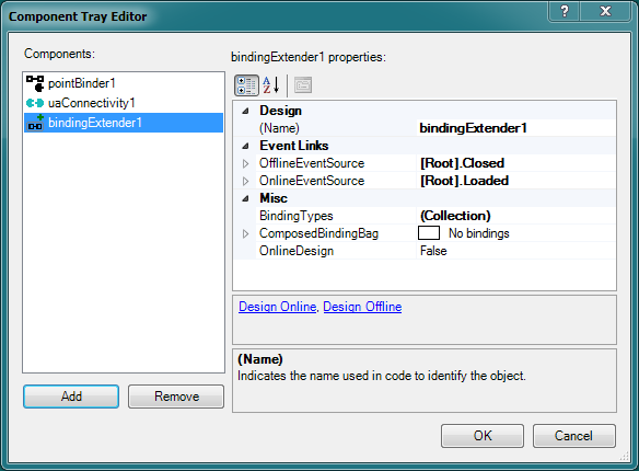 Traditionally, WPF uses XAML to describe visual components only. For this reason, the WPF Designer does not show a component tray. In Live Binding for WPF, its functionality is provided by an add-on dialog, a Component Tray Editor.