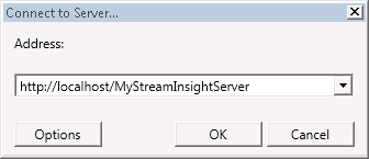 - In the “Connect to Server…” dialog, enter the address as http://localhost/StreamInsight/MyStreamInsightServer , and press OK.