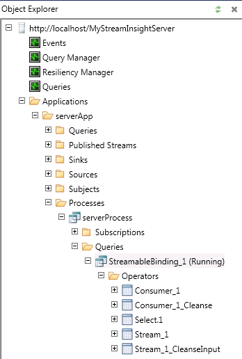 - In the Object Explorer pane of the StreamInsight Event Flow Debugger, navigate and expand nodes as follows:
