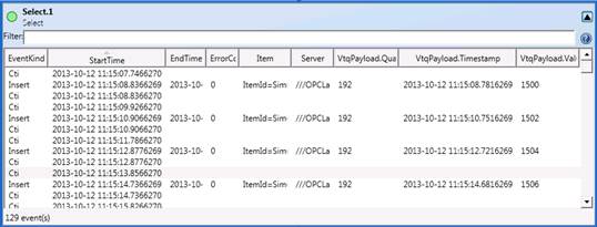 - You can now view the events at various stages of the query processing, by clicking the downwards-pointing triangle in any of the query operators. For example, events on the “Select.1” operator may look like this: