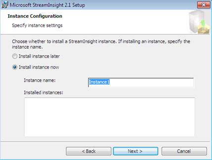 2. Go through the installation wizard pages, accepting defaults or entering information as needed. On the “Instance Configuration” page, select “Install instance now” option, and enter “Instance1” (without the double-quotes) into the “Instance name” field. Creation of this instance is recommended now (although you can create it later), because it is the instance that we use in our examples.
