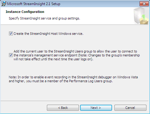 3. Continue going through the installation wizard pages. We recommend that you check the “Add the current user to the StreamInsight Users group…” box. Finalize the installation wizard then.