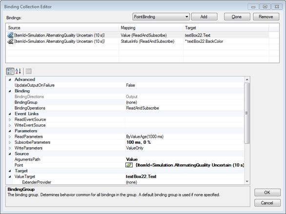 After selecting the “Bind to Point” command, you select the OPC data you want to bind to, and you are done. The currently configured bindings appear as additional entries in the Properties window: