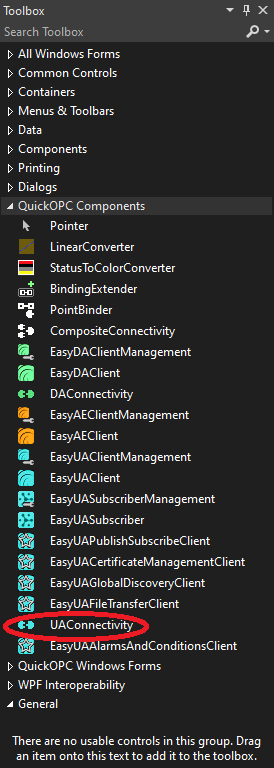Drag the UAConnectivity component from the “QuickOPC Components” tab of the Toolbox to the form’s design surface.
