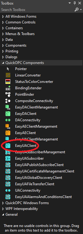 Instantiate the EasyUAClient component in the form: Drag the EasyUAClient component from the “QuickOPC Components” tab of the Toolbox to the form’s design surface.