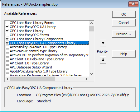 Note: If some of the QuickOPC the type libraries are not shown in the References list, use the button to locate and select them manually. The type libraries are installed under the SDK\lib subdirectory under the QuickOPC installation folder. Sometimes, simply restarting the Visual Basic 6.0 helps.