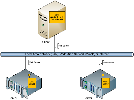 The most typical use of QuickOPC-UA involves a thick-client user application written in one of the Microsoft .NET languages. This application uses the types from QuickOPC-UA object model, and accesses data within OPC servers that are located on remote computers on the same LAN (Local Area Network) or on WAN (Wide Area Network) or on the Internet. The communication with the target OPC server is performed by means of Web Services.
