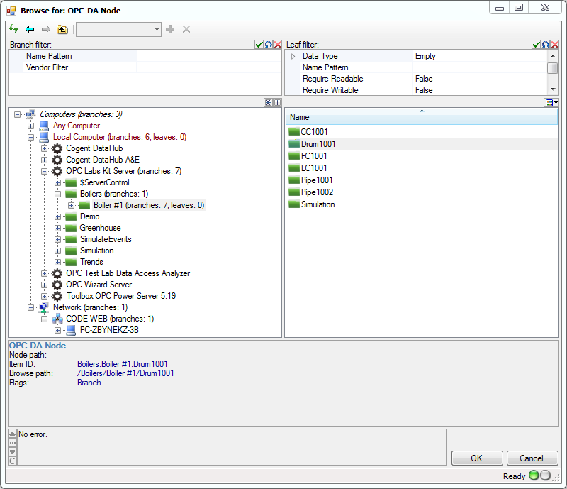 Here is an example of the generic OPC browsing dialog in action: