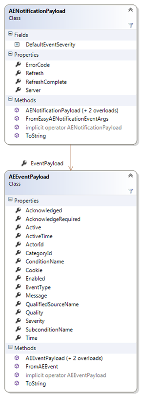 The event payload class for OPC Alarms&Events is the AENotificationPayload class. This class contains an embedded AEEventDataPayload object, which contains the actual OPC event. This object is always present; in case of errors and special cases, it contains default or pre-defined values.