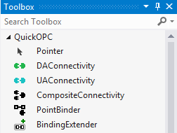 In Windows Forms projects, the Toolbox Items (live binding components) appear right in Visual Studio’s Toolbox under the “QuickOPC” tab: