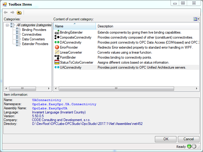 As a result, in most cases you can simply “forget” about the need to place the BindingExtender or the PointBinder onto the component tray – simply place the connectivity (DAConnectivity, UAConnectivity or CompositeConnectivity) from the toolbox items onto the component tray, and the rest will be taken care of. Just remember that you should not delete the BindingExtender or the PointBinder from your form (window), even though you have not explicitly placed it there.